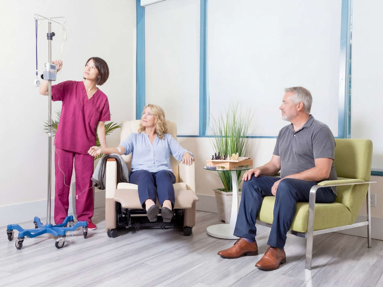 - Cómodas salas de infusión Con Wi-Fi, transmisión de contenido y refrigerios gratuitos.